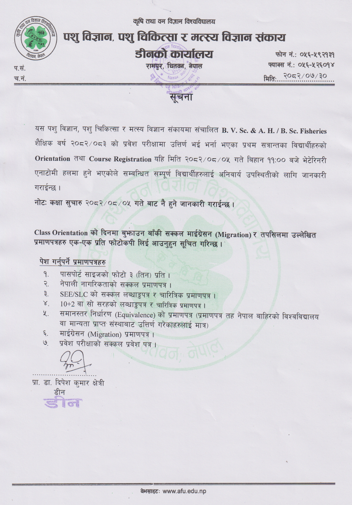 Notice regarding Orientation & Course Registration of B.V.Sc.& A.H., B.Sc.Fisheries